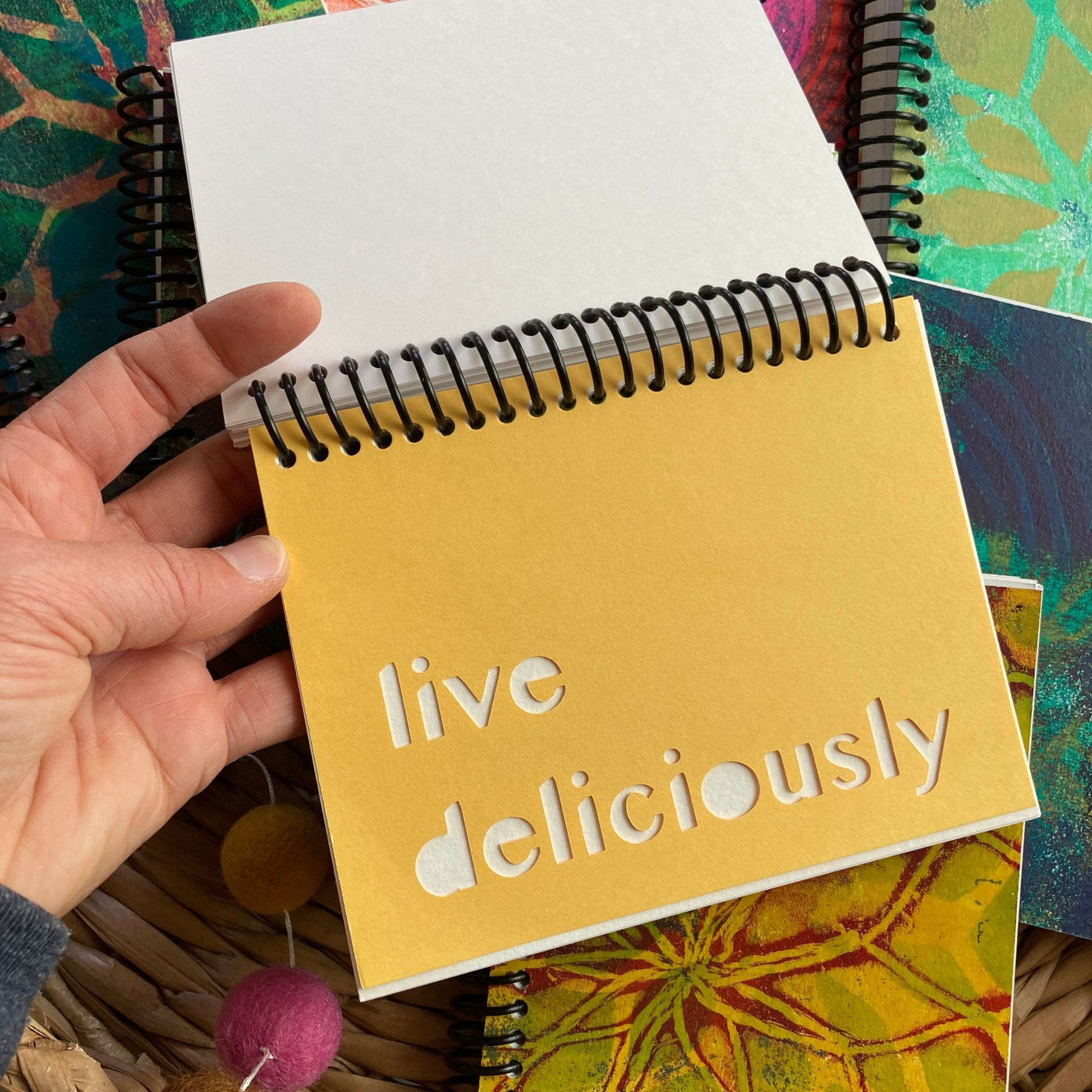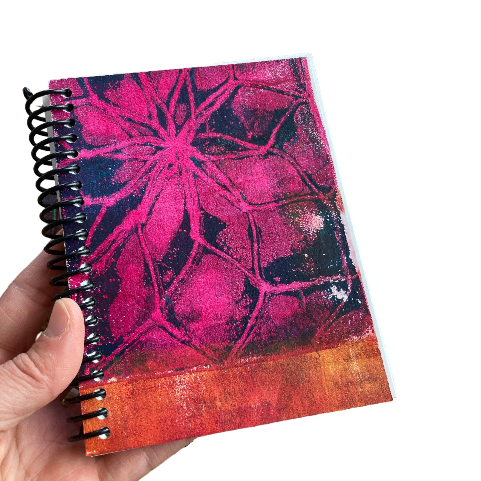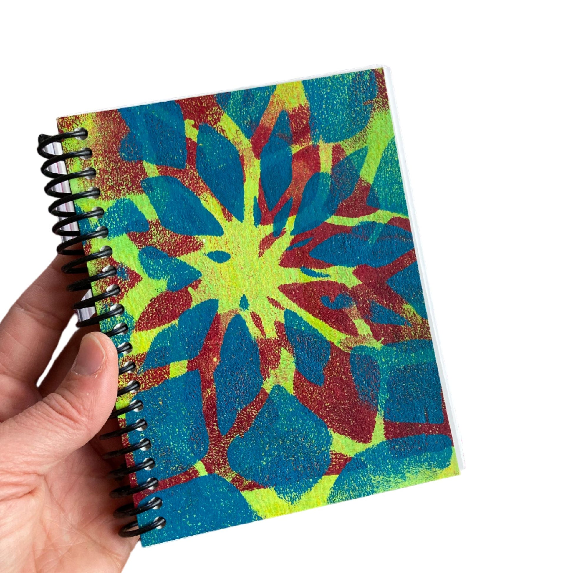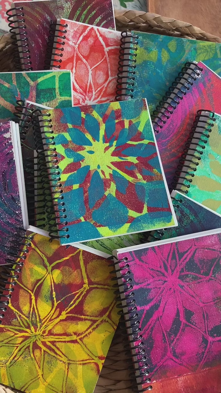 Each handmade sketchbook cover is a unique hand-printed acrylic design. The black plastic ring binding allows the sketchbook to lay flat, whether you're working vertically or horizontally, providing you with a comfortable and stable surface to draw and paint.